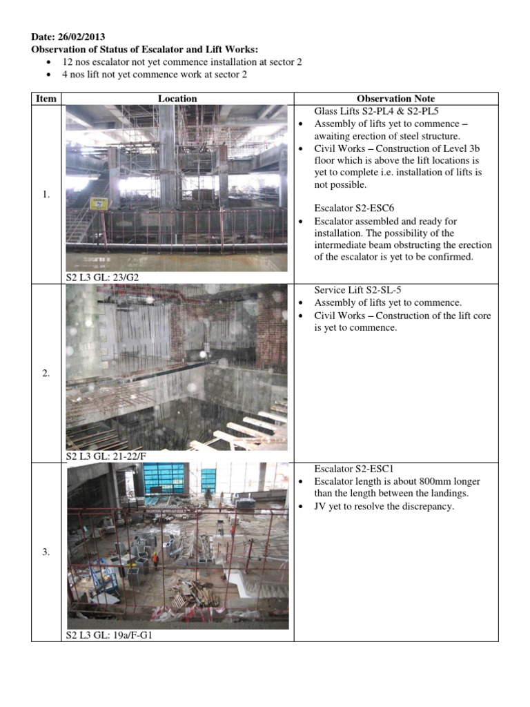Site Observation Report Sample Escalator Elevator