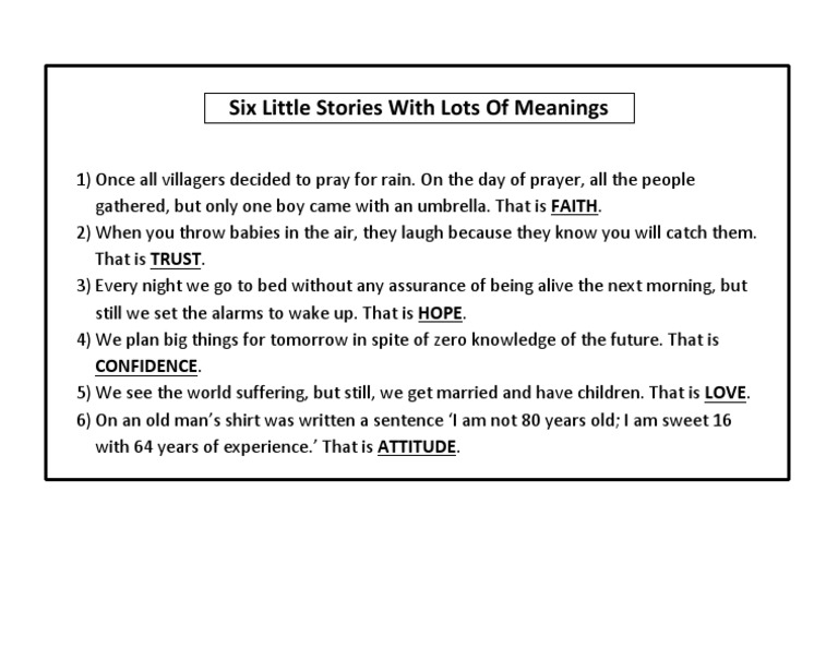 On the day of prayer, all the people gathered, but only one boy. Get inspired by the wisdom and life lessons they offer. Six little stories with lots of meaning 1. Explore these six little stories that are full of meaning. Once all villagers decided to pray for rain.