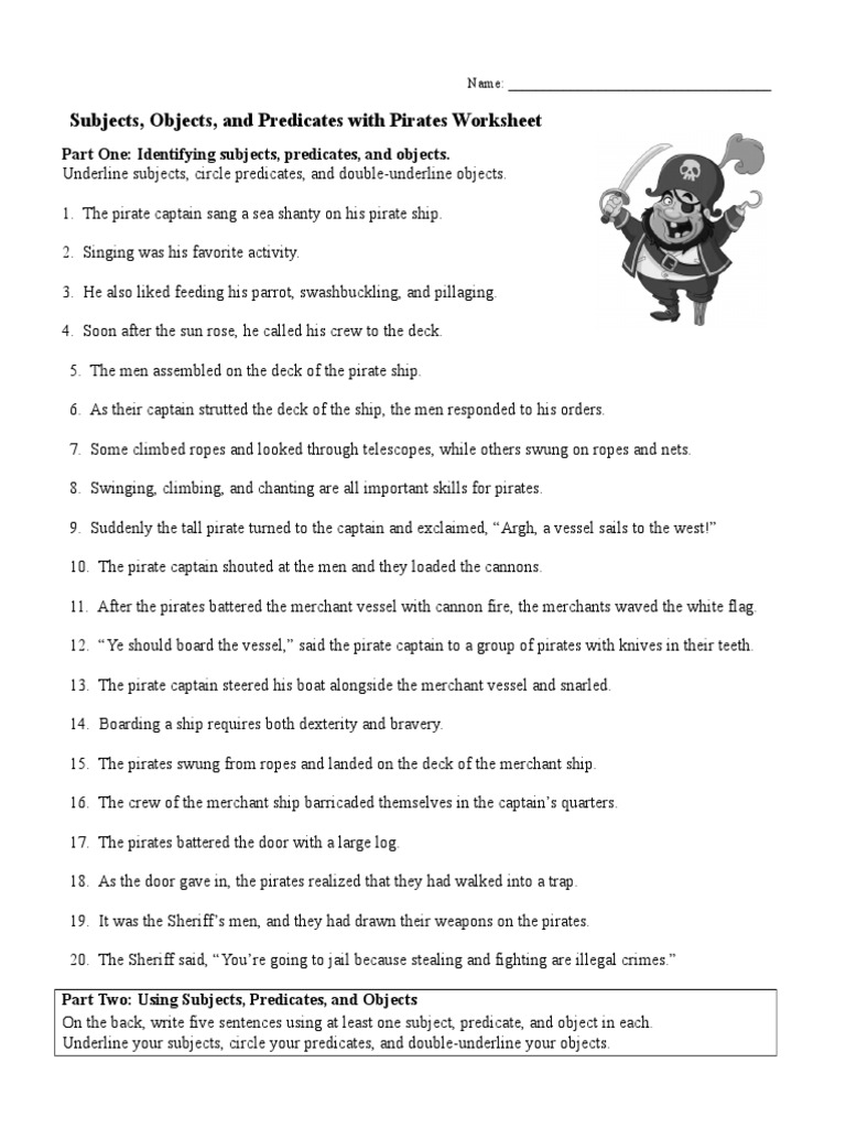 Subjects Objects And Predicates With Pirates Worksheet - The document provides a worksheet with instructions to identify subjects, predicates,. Here is an exciting sentence structure worksheet. Showing 8 worksheets for subjects objects and predicates with pirate answer. Students read 20 exciting sentences about.