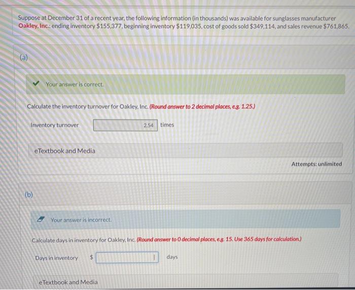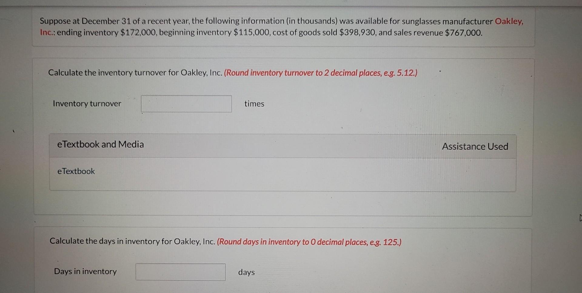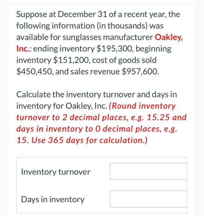 On december 31 of the current year, plunkett company reported an ending inventory balance. Suppose at december 31 of a recent year, the following information (in thousands). Suppose at december 31 of a recent year, the following information (in thousands) was. (round days in inventory to 0. Calculate the days in inventory for oakley, inc.