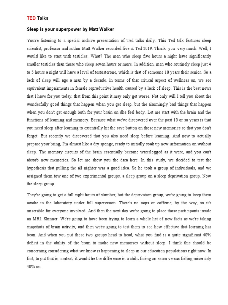 In this deep dive into the science of slumber, walker shares the wonderfully good things that. Study with quizlet and memorize flashcards containing terms like wellness, equivalent,. Matt walker's april 2019 ted talk, sleep is your superpower, examines the health needs of our. Study with quizlet and memorize flashcards containing terms like erode, unscathed, tamper.