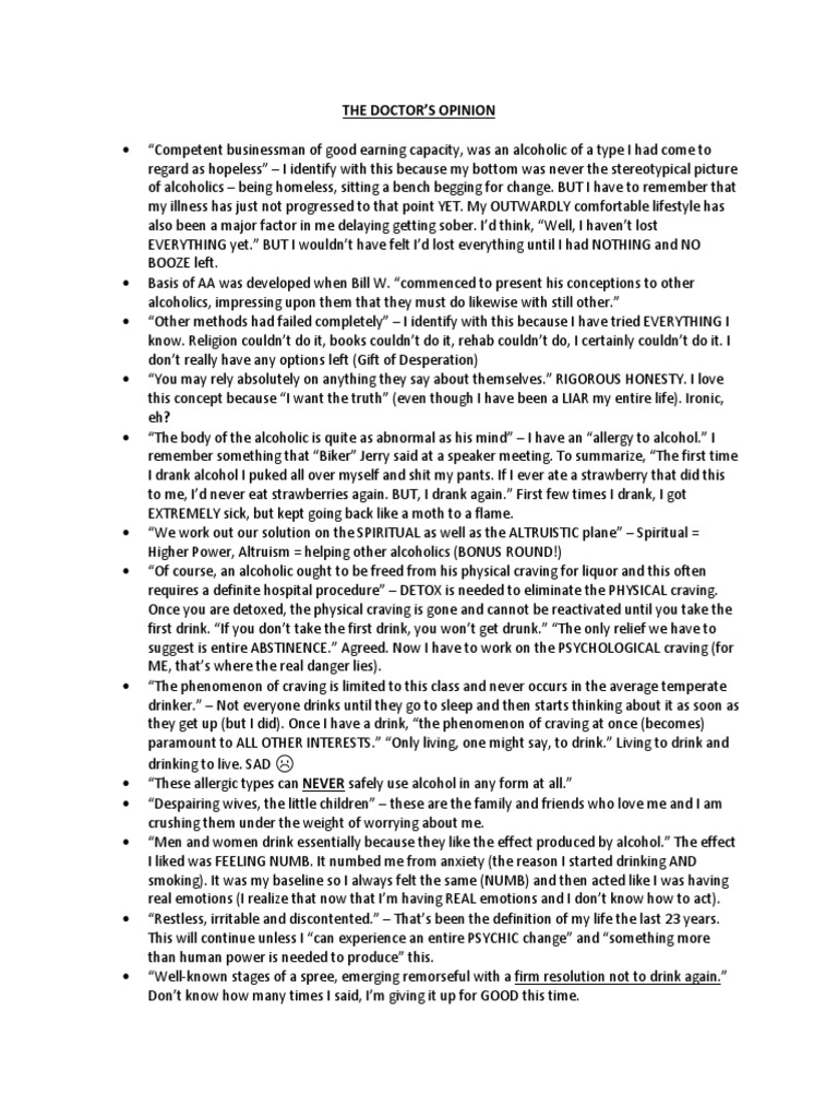 The doctor's opinion 1 we of alcoholics anonymous believe that the reader will be interested in the medical estimate of the plan. Called the doctor's opinion. this also has been kept intact, just as it was originally written in 1939 by the late dr. Convincing testimony must surely come from medical men who have had experience with the sufferings of our members and have witnessed. The doctor defends to the medical profession and others his faith in the fledgling fellowship then forming among some recovered alcoholics by.