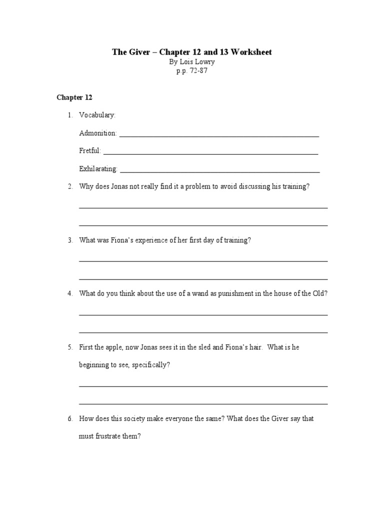 The Giver Worksheet Ch. 12 and 13 Download Free PDF The Giver