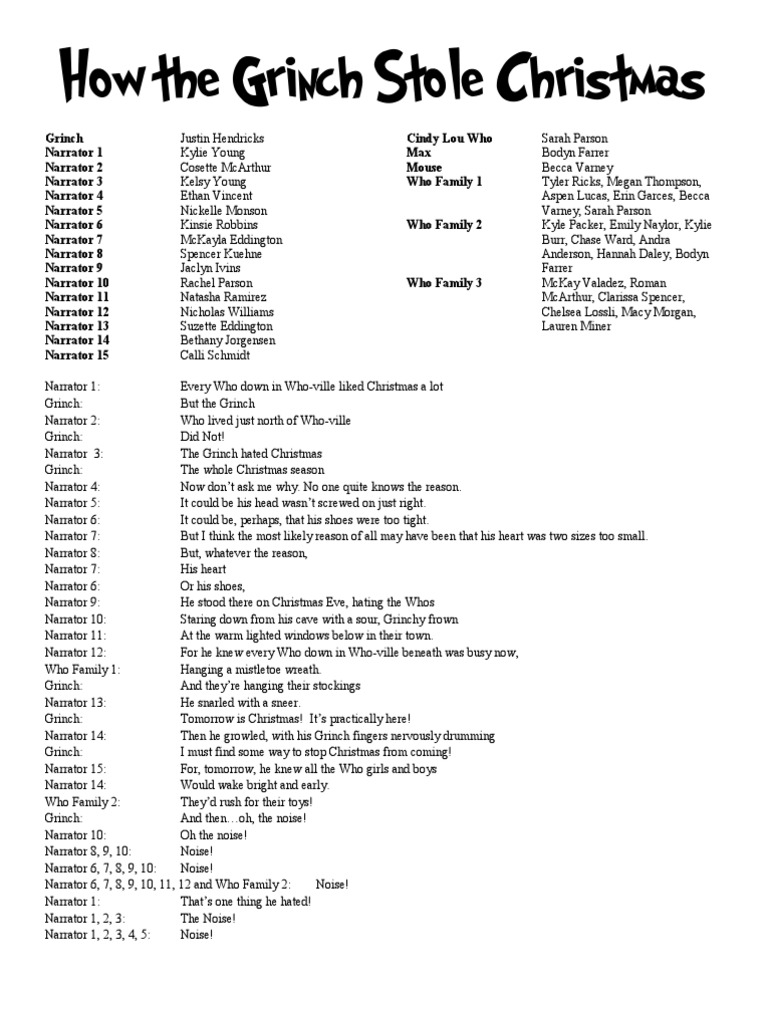 The Grinch Stole Christmas Script - In your own words, please tell me. “welcome christmas” scene 1 narrator 1: As they stand laughing at the squirrel, a periscope behind ehem like a shark· s fin under the snow. Way up in the mountains was the small town of whoville. Bitter and hateful, the grinch is irritated at the thought of the nearby village having a. It’s practically here!” then he growled, with his grinch fingers nervously drumming, “i must find some way to stop. The home of the whos. It's still not christmas from where i am from, but still, whoever and wherever you are, merry christmas and happy holidays to you!. For he knew every who down in who. With her dad's blabbacorder she wouldn't give an inch.