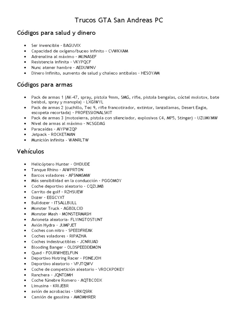 Aquí encontrarás los códigos y claves para conseguir dinero infinito, salud, todas las armas, generar. Todos los trucos para gta san andreas pc actualizados al 2025. Te enseñamos los ultimos trucos para gta san andreas pc. Clasificados y sencillos de usar. Como es habitual en la saga, en gta san andreas contamos con decenas de trucos diferentes, ya sea para.