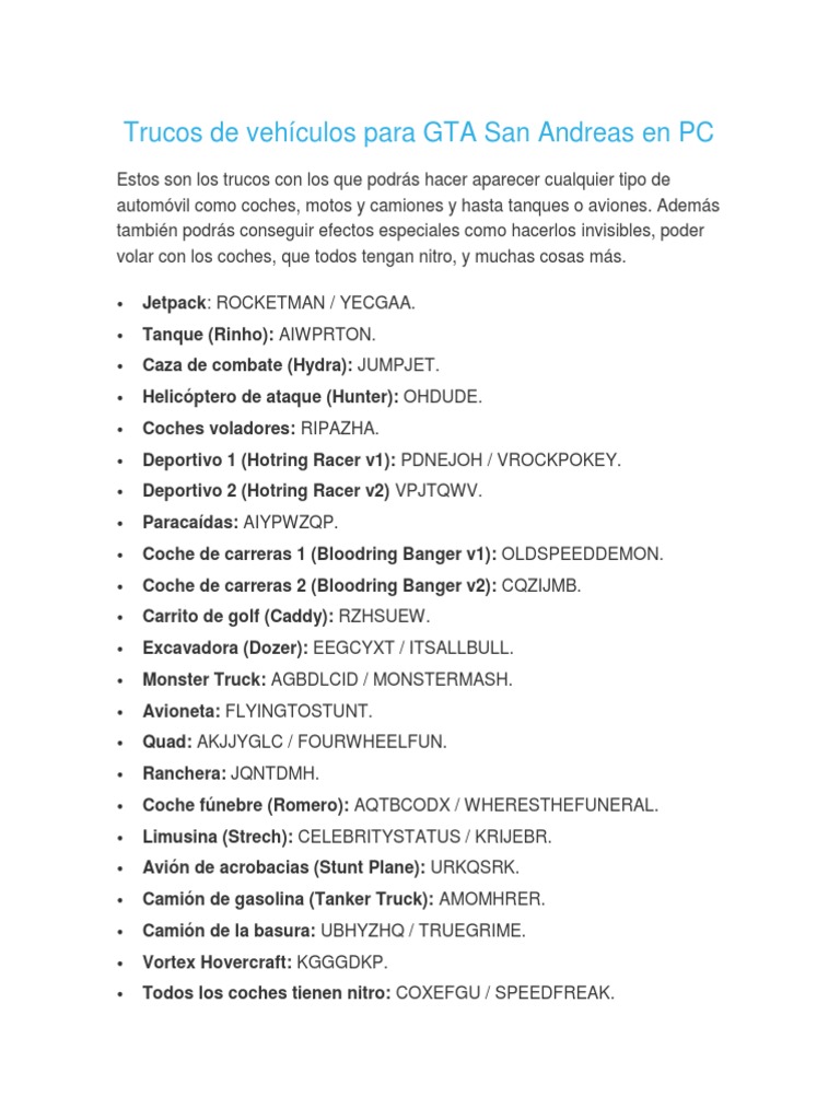 Trucos de gta san andreas para pc con todos los códigos para conseguir salud infinita, munición infinita, vehículos y habilidades especiales. Consigue todas las armas, hazte con munición y vida infinita, y desata el modo caos en pc con estos trucos de gta san andreas. Te enseñamos los ultimos trucos para gta san andreas pc. Como es habitual en la.