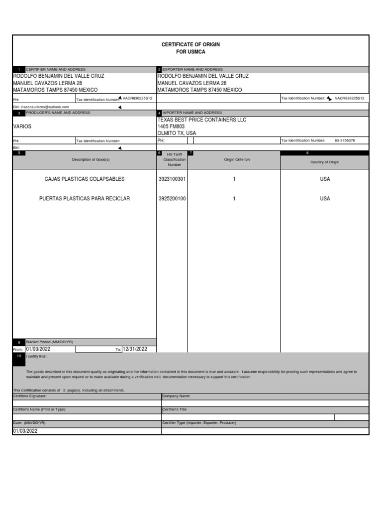 Certifier name & address and tax id no.: How to complete a usmca form: Provide a good description of the product. Usmca implementation instructions this document may qualify as a “guidance. The usmca dictates that “the description should.
