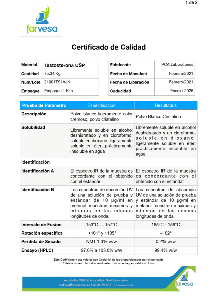 COA Testosterona USP Jan 26 PDF Solubilidad Metrología