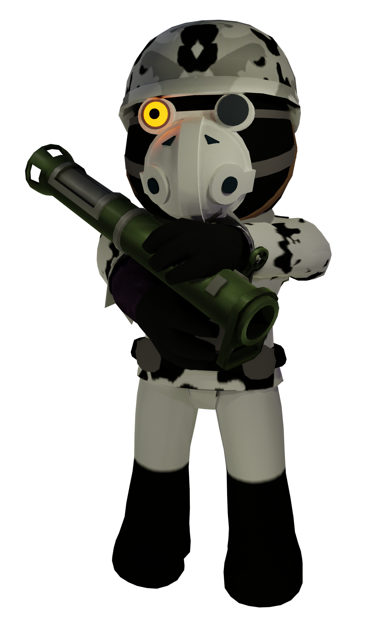 This could be the gorilla from gorillairways in. I think delta is some sort of primate. Yes, in a recent post by ‘piggy news’, they have revealed that delta is a gorilla. He holds a bazooka as his weapon, and is dressed in a snow plains camouflage suits, with a camo hat. Delta is the main bot for the map.