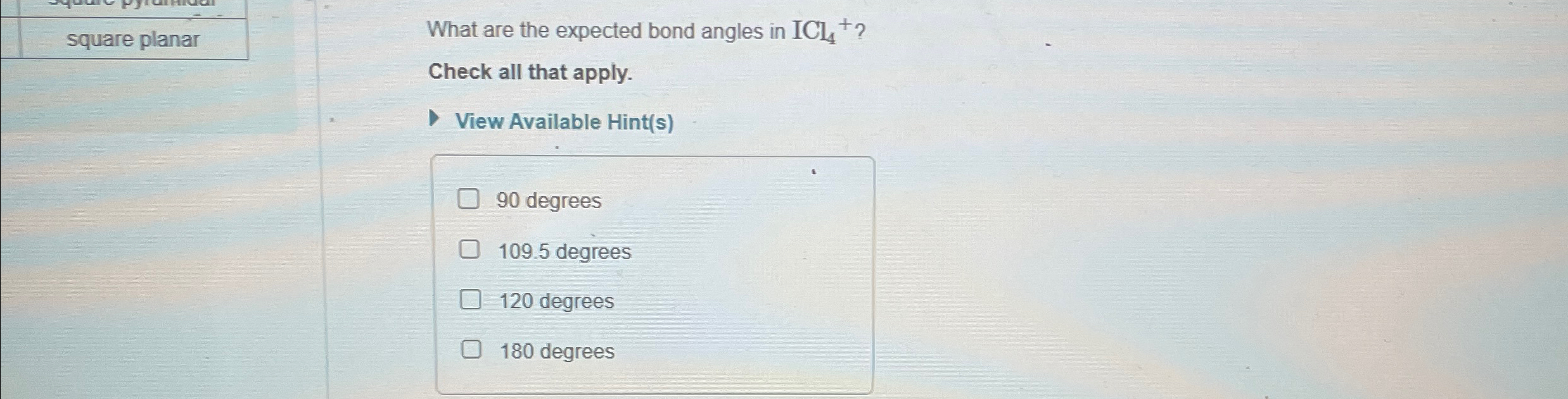 SOLVED What are the expected bond angles in ICl? Check all that apply