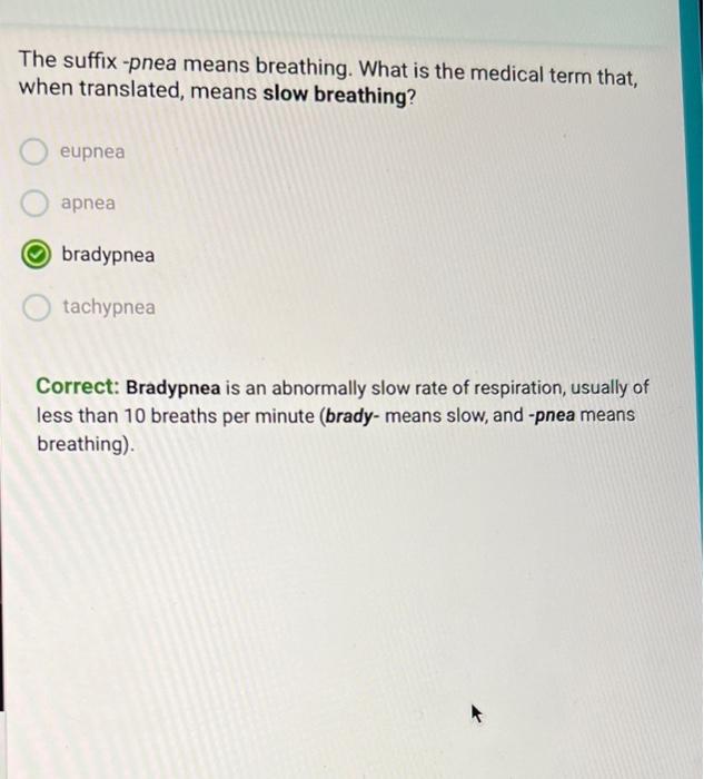 Study with quizlet and memorize flashcards containing terms like apnea, bradypnea,. Suffix meaning breath, breathe, or breathing. It is used in many medical.