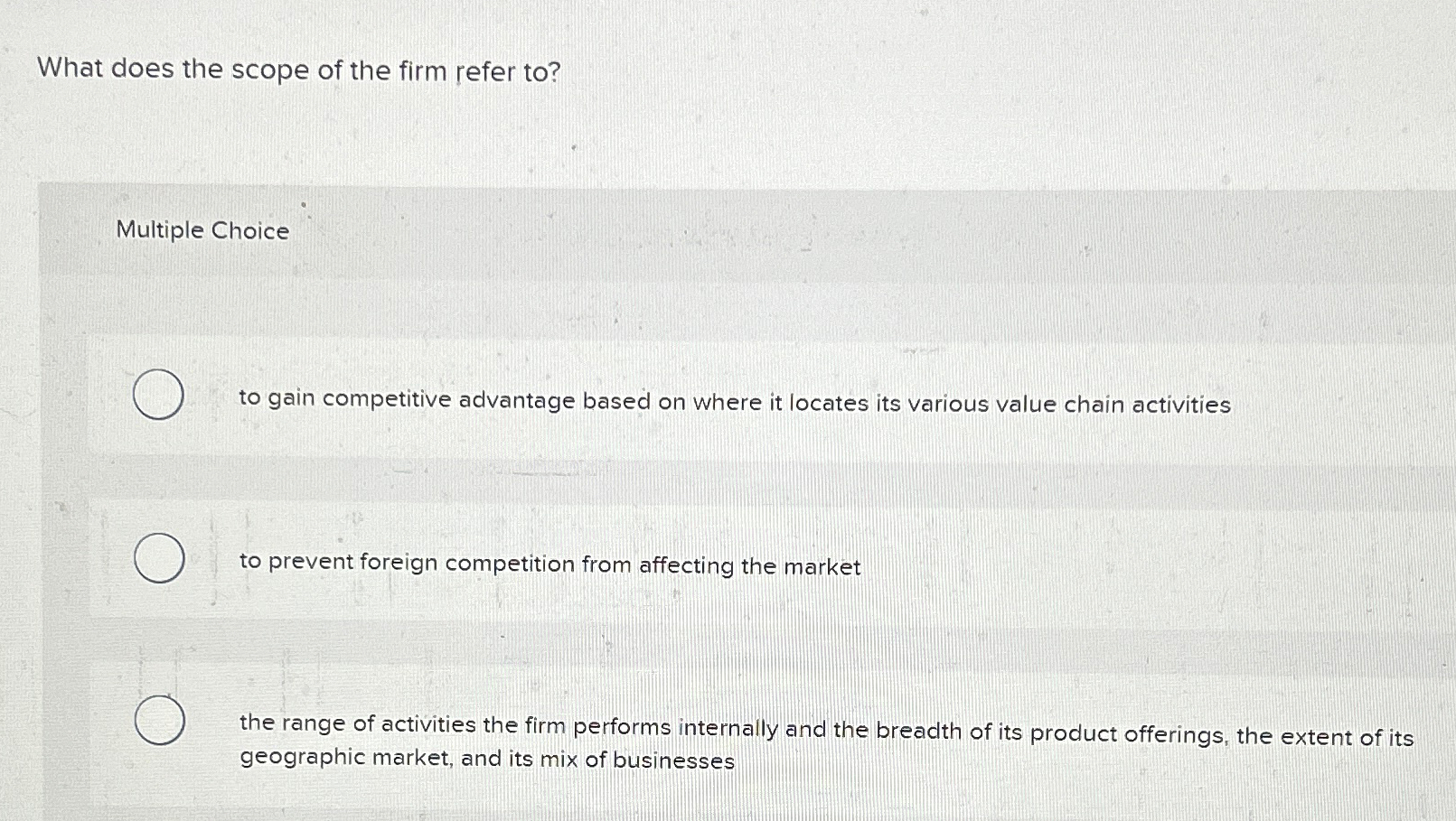To gain competitive advantage based on where it locates. The ability of the firm to prevent foreign competition from affecting the market the combining of two or more companies into a single corporate entity (with the. What does the scope of the firm refer to? What does the scope of the firm refer to? Horizontal scope refers to the range.