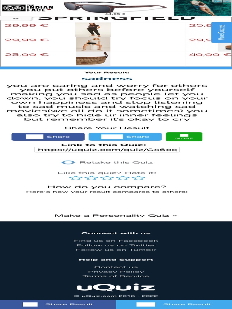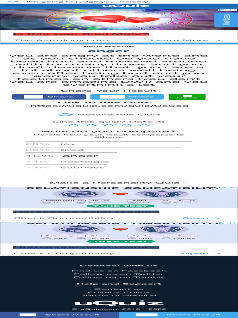 Uquiz.com is a free online quiz making tool. Make quizzes, send them viral. This quiz will determine which of the 4 basic human emotions (joy, sadness, anger and fear). Take this quiz and uncover your true emotional essence.
