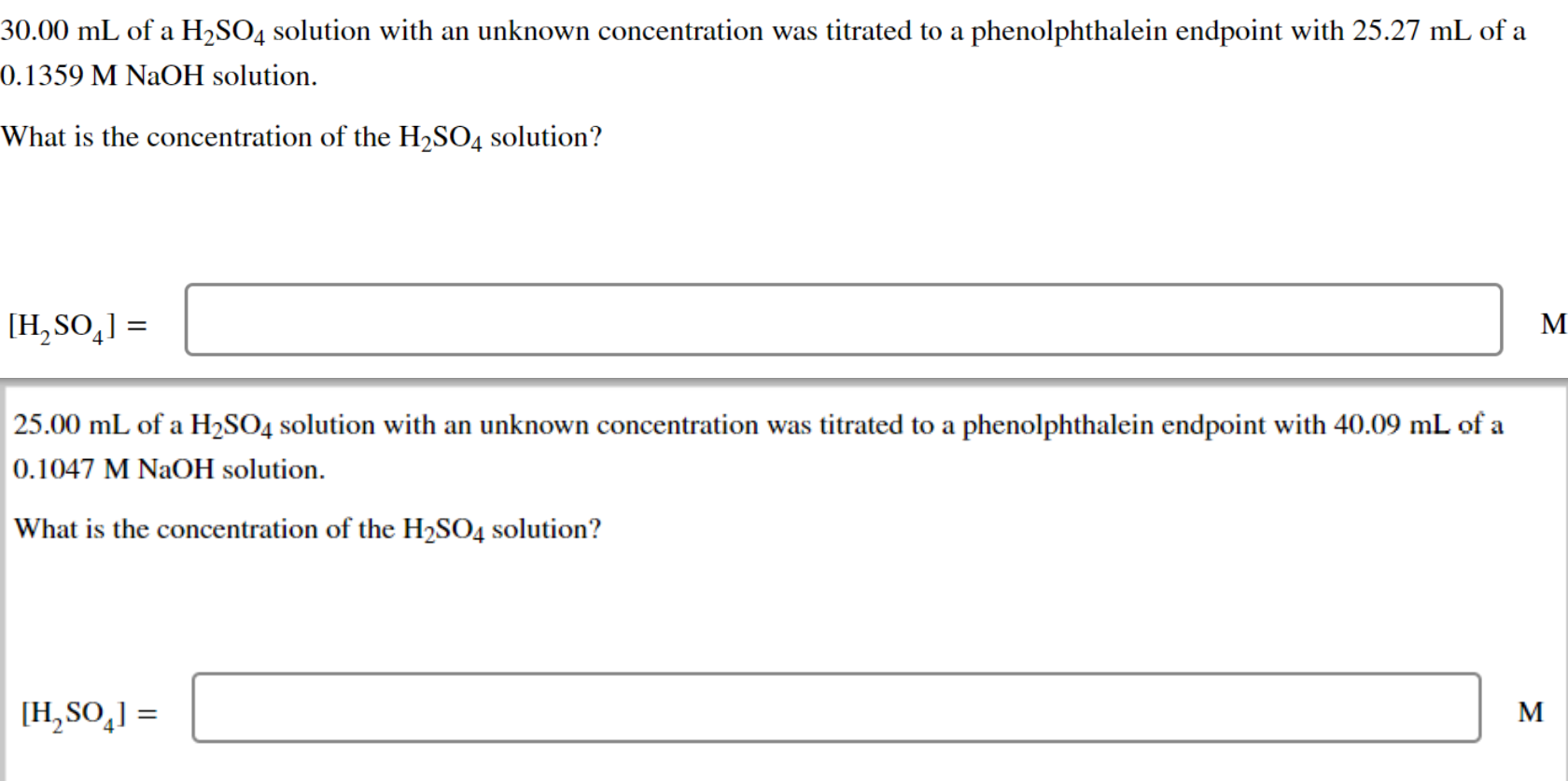 What is the concentration of the unknown h2so4 solution? Express your answer using four significant figures., a 5.00 ml sample of an. To determine the concentration of the unknown h2so4 solution, we can use the stoichiometry of the reaction between h2so4. 20.0020.00 ml of a h 2 so 4 solution with an unknown concentration was titrated to a phenolphthalein endpoint.
