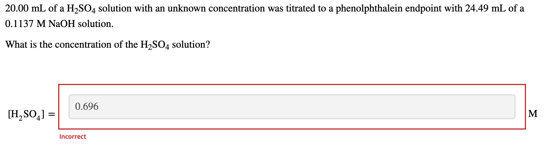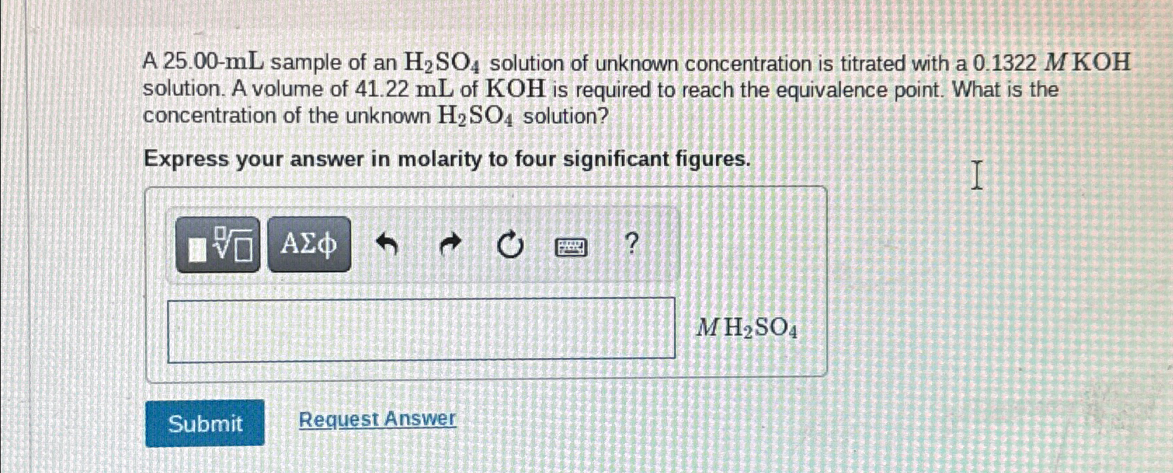 Express your answer using four significant figures., a 5.00 ml sample of an. What is the concentration of the unknown h2so4 solution? 20.0020.00 ml of a h 2 so 4 solution with an unknown concentration was titrated to a phenolphthalein endpoint with 35.7135.71 ml of. To find the concentration of an unknown solution, you would typically use a titration method.