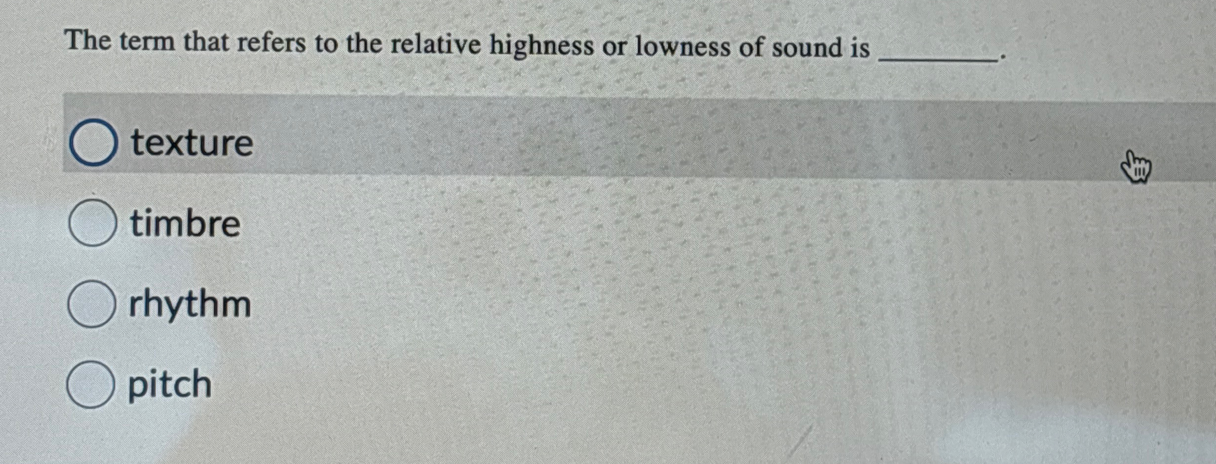 Study with quizlet and memorize flashcards containing terms like what is the relative highness or lowness of a sound called?, from. The relative highness or lowness of a sound is known as pitch, which depends on the frequency of sound waves produced. Pitch specifically refers to the perceived frequency of a sound and is the term used to describe the.