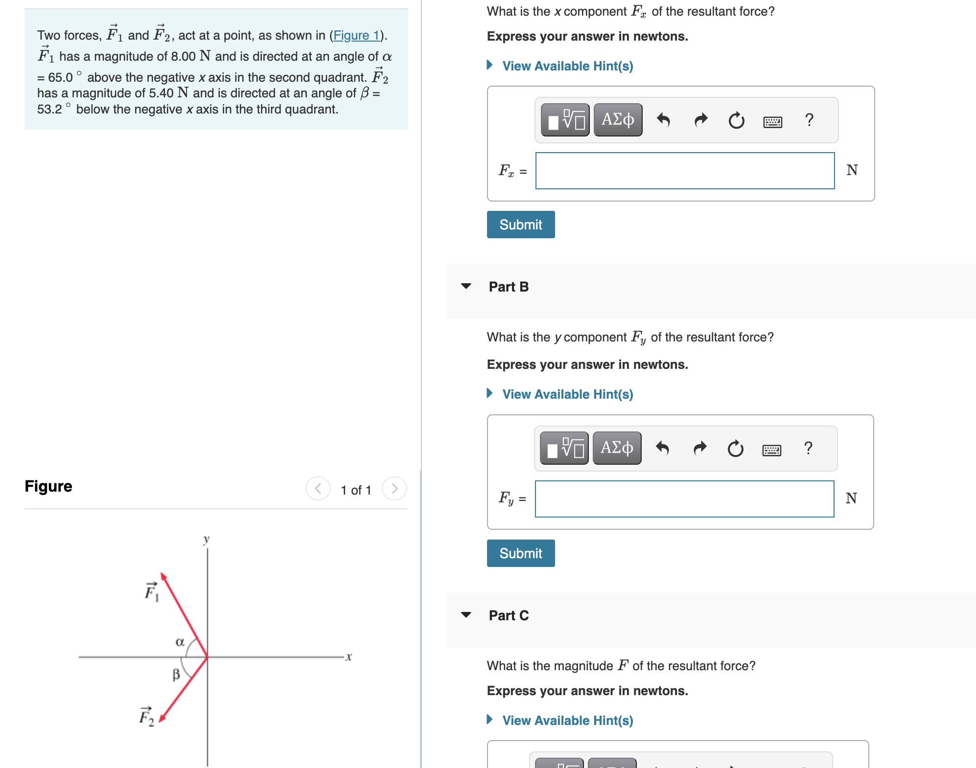 The resultant force, f, can be found by calculating the x and y components of each force and then using pythagoras' theorem. A) to find the x component of t. There are 2 steps to solve this one. Two forces, f1 and f2, act at a point, as shown in the picture.