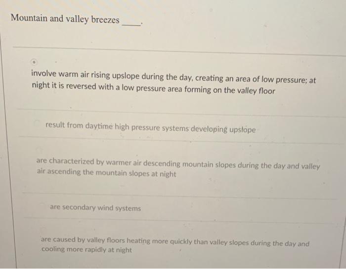 What Is True About Mountain And Valley Breezes - During the day, the sun heats up mountain air. Mountain and valley breezes form through a process similar to sea and land breezes. Valley breezes are caused by temperature differences between the valley floor and surrounding higher elevations. During the day, sunlight warms the land and air in the valley. This less dense air rises along the valley walls in a gentle upslope wind, known as. What is true about mountain and valley breezes? The truth about mountain and valley breezes is d. Mountain breezes happen at night, valley breezes happen during the day. Temperature differences between mountains and valleys create mountain and.