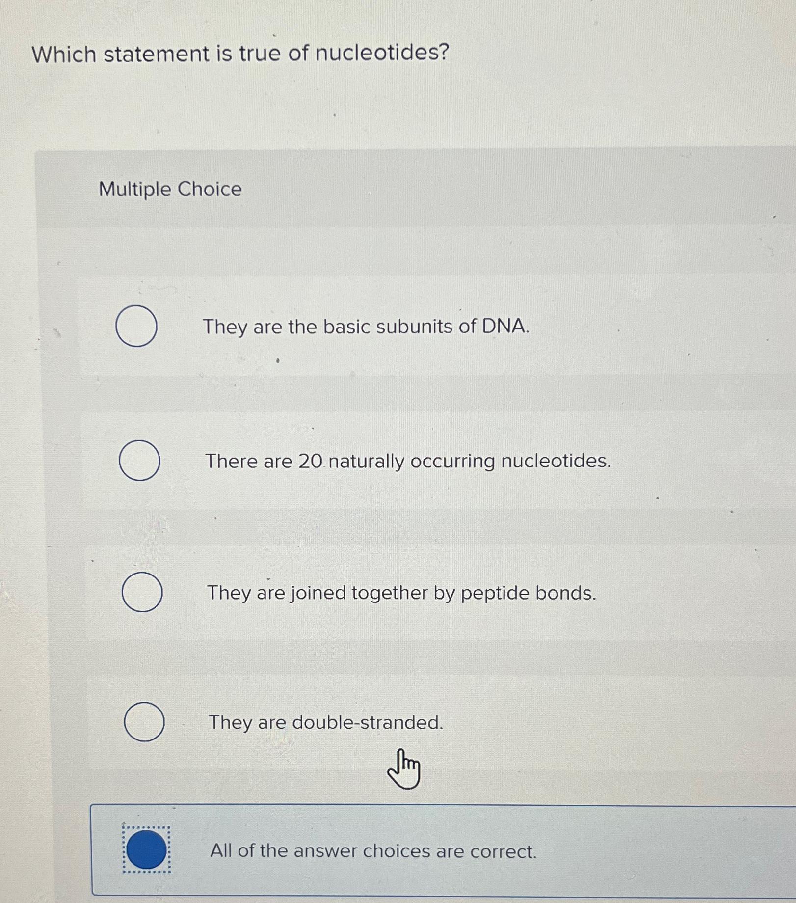 Which statment below about nucleotides is true ? The correct statement about nucleotides is that they contain a sugar which is either deoxyribose in dna or ribose in rna. What is the sequence of the. Which statement below about nucleotides is true? The true statement about nucleotides is that the order of nucleotides in dna determines the proteins produced. Which statement below about nucleotides is true? Base pairing occurs between the 5' and 3' carbons of the sugar in a nucleotide. Base pairing occurs via hydrogen bonds between bases in complementary strands of dna. Among the following choices, the statement a deoxynucleotide triphosphate (dntp) becomes a dna nucleotide during polymerization is true.