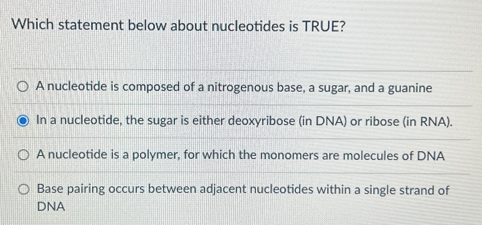 The correct statement about nucleotides is that they contain a sugar which is either deoxyribose in dna or ribose in rna. Which statement below about nucleotides is true? Base pairing occurs between the 5' and 3' carbons of the sugar in a nucleotide. What is the sequence of the. Among the following choices, the statement a deoxynucleotide triphosphate (dntp) becomes.