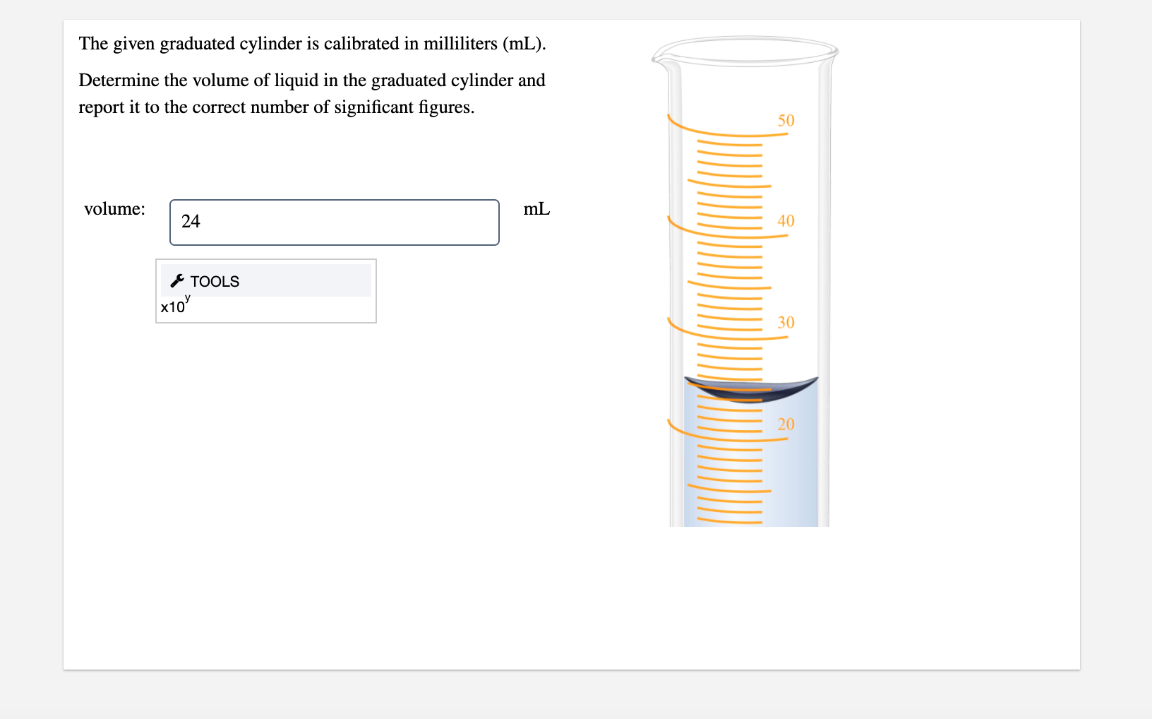 Determine the volume of liquid in the cylinder: Study with quizlet and memorize flashcards containing terms like 21. What is the volume of the liquid in the graduated cylinder in the picture? Here the first digit is 6, since the last labelled graduation below the meniscus is six. We need to determine the volume given in the graduated cylinder shown.