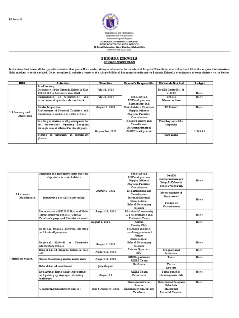 FBHS BE Form 2 SCHOOL WORK PLAN PDF Teachers