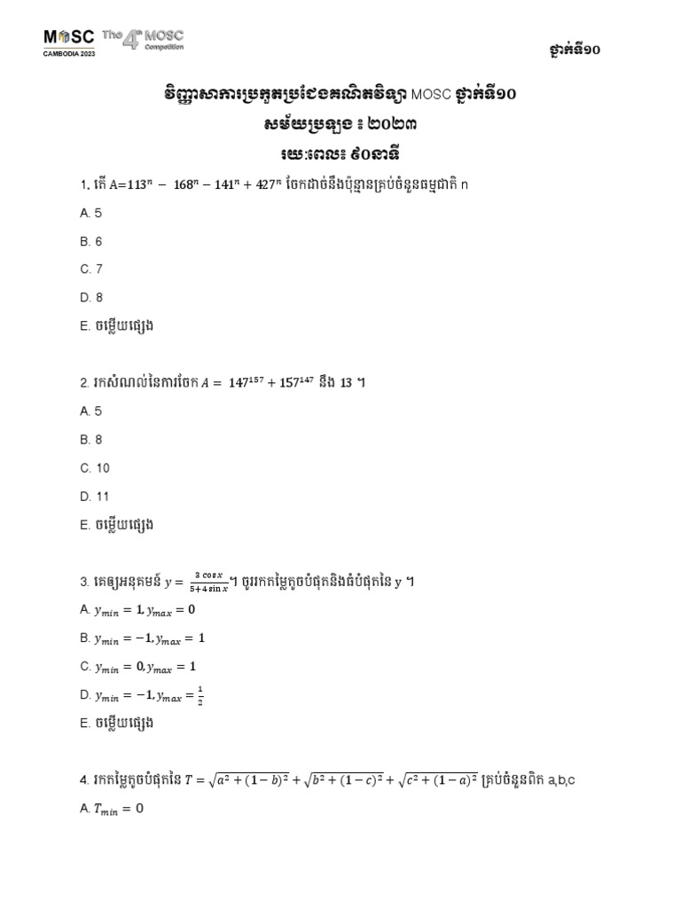 វិញ្ញាសាការប្រកួតប្រជែងគណិតវិទ្យា MOSC ថ្នាក់ទី១០ PDF