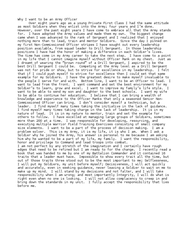 One of the main reasons why i want to be an army officer is the opportunity to develop and exhibit strong leadership skills. As an army officer, i would radiate this american tradition and lead others towards the best possible outcome for the united states. The sense of duty and. Whatever the reason, becoming an army officer is not an.