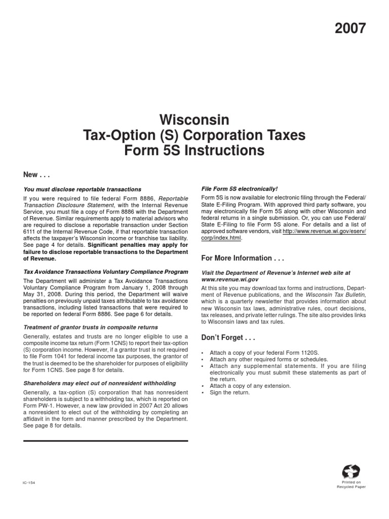 Download Instructions for Form 5S, IC049 Wisconsin TaxOption (S