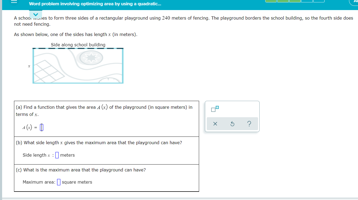 Word problem involving optimizing area by using a quadratic function a school wishes to form three sides of a rectangular playground using 360. Word problem involving optimizing area by using a quadratic function tom wants to build a fence for his rectangular garden. He has 360 meters of.