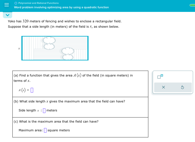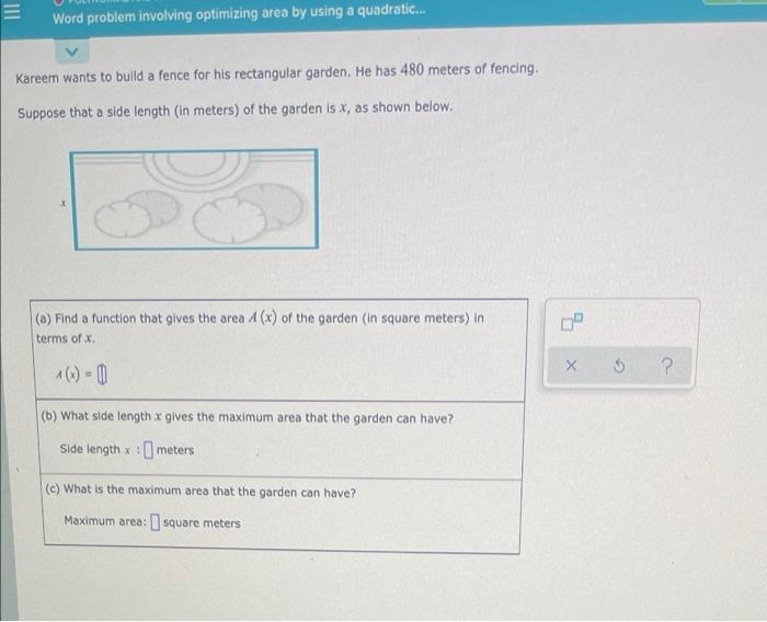 Word problem involving optimizing area by using a quadratic function tom wants to build a fence for his rectangular garden. Word problem involving optimizing area by using a quadratic function a school wishes to form three sides of a rectangular playground using 360. He has 360 meters of.