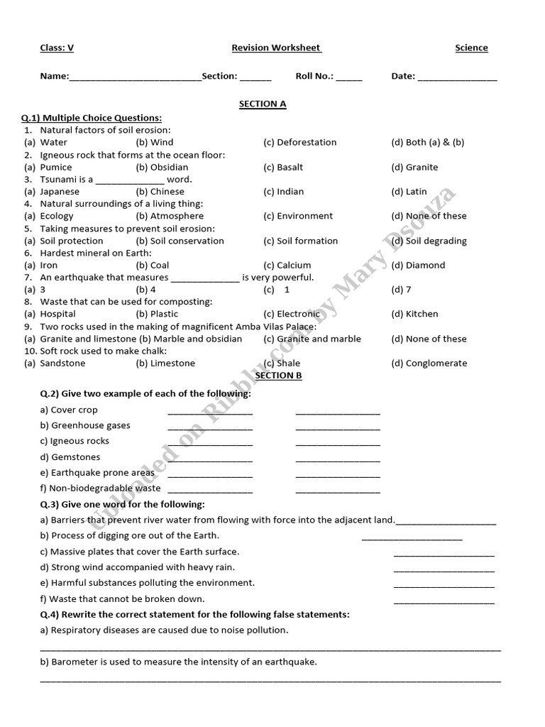 Class 5 Science Worksheets Assignments 1 PDF Rock (Geology) Soil