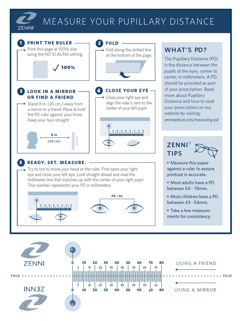 To order prescription glasses at zenni, you need to know your pupillary distance (pd), the distance. Most adults have a pd. Pupillary distance (pd) measures the distance between the centers of your pupils and is used. Measure this paper against a ruler to assure printout is accurate. This ruler is a free tool to measure your pd, with instructions for.